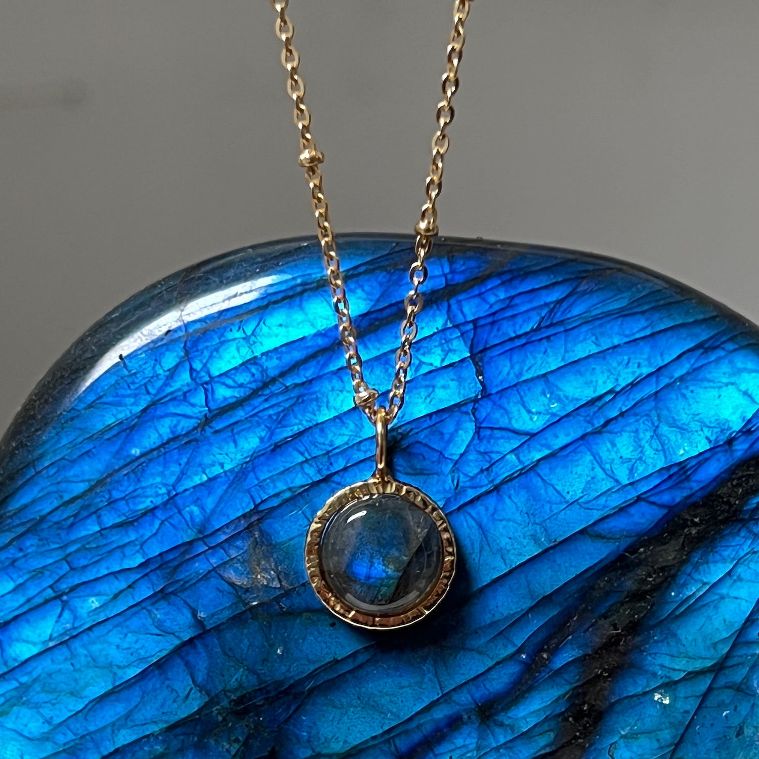 - Dunia Labradorite Round Pendant On Long Satellite Chain